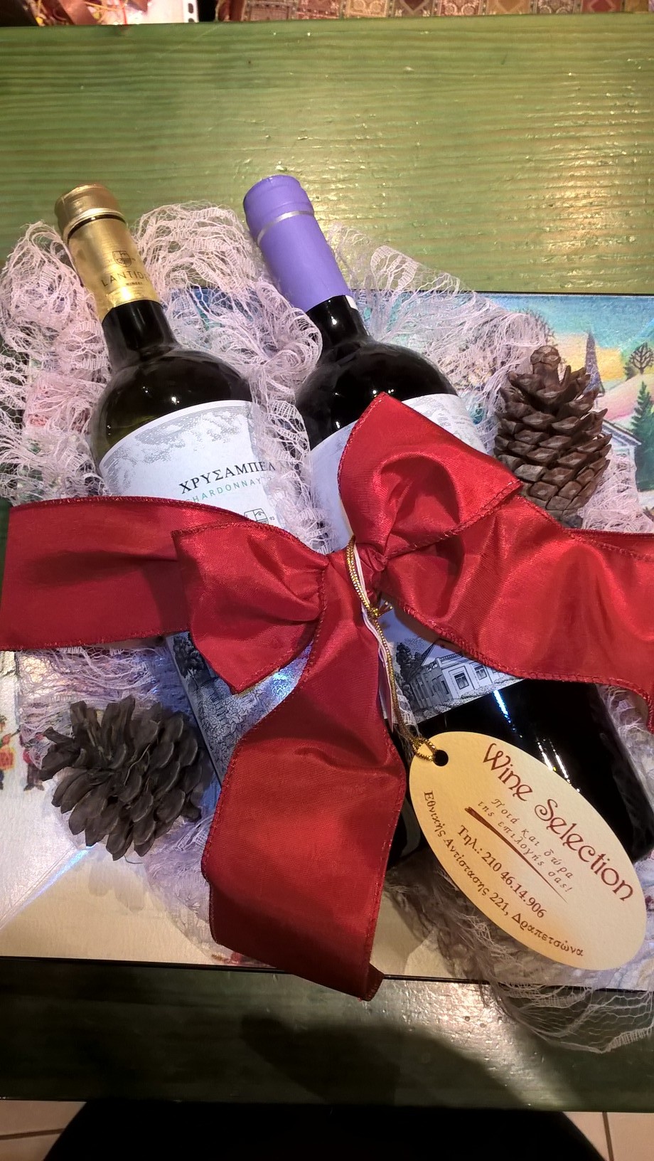 Καλάθι μπαμπού με μεταλλικά χερούλια και 2 φιάλες κτήμα Λαντίδη συν σοκολατάκια. ΝΕΜΕΑ (ερυθρό) και ERGO (ροζέ).